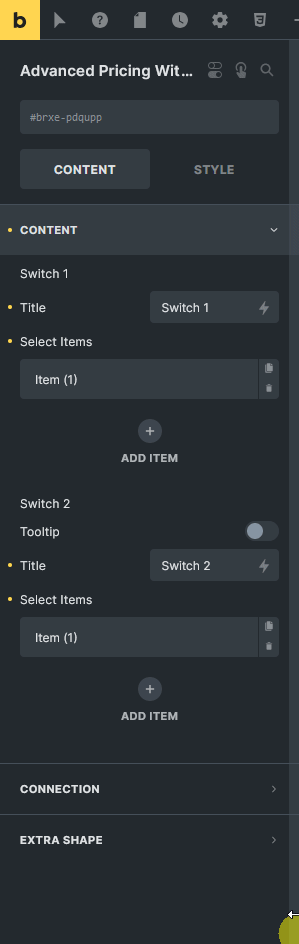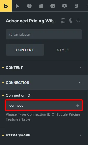 Then in the Advanced Pricing with Toggle element go to the Connection tab and add an ID in the Connection ID field.