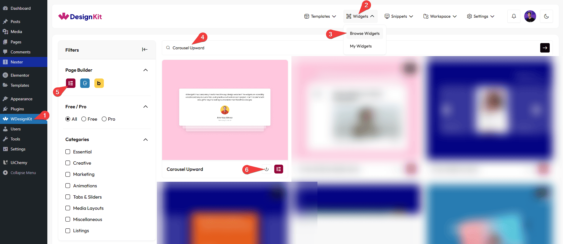• Search the widget name and select Elementor as the Page Builder.