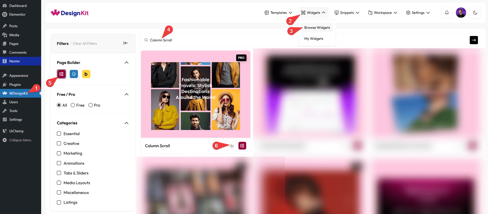 • Search the widget name and select Elementor as the Page Builder.