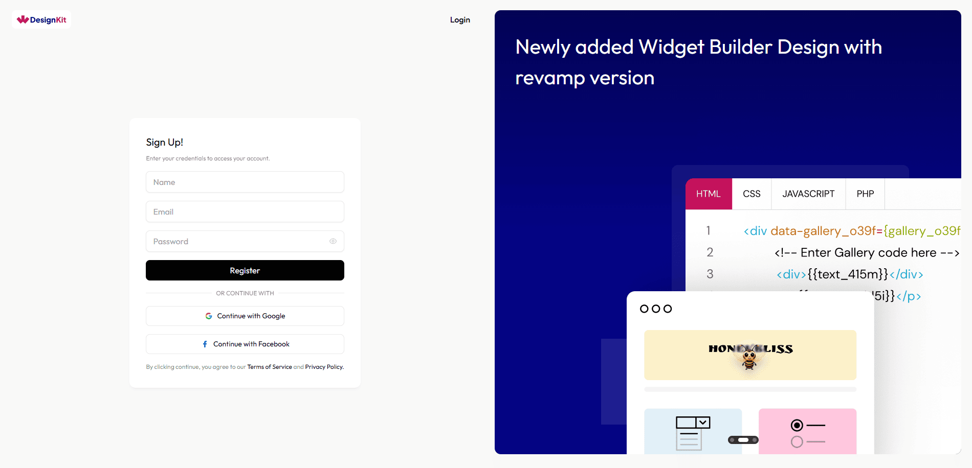 3. Click on the Create an account button, which will redirect you to the WDesignKit website signup page. From here, you can either sign in using your Google or Facebook account too