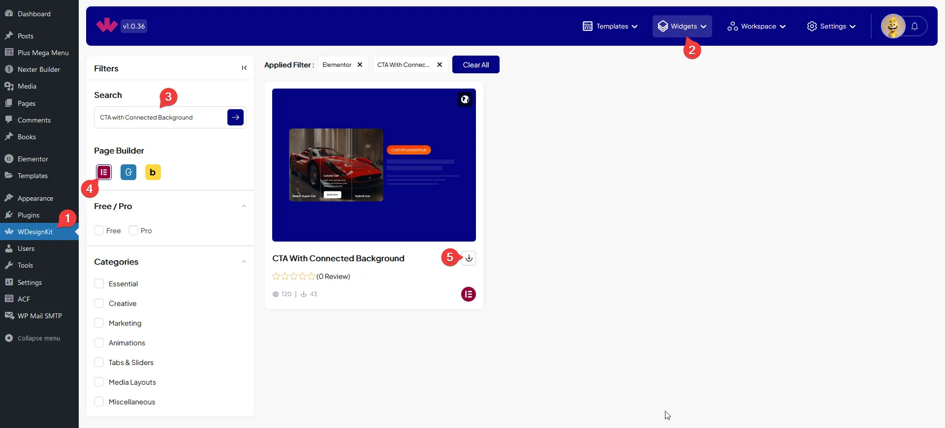 • Search the widget name and select Elementor as the Page Builder.