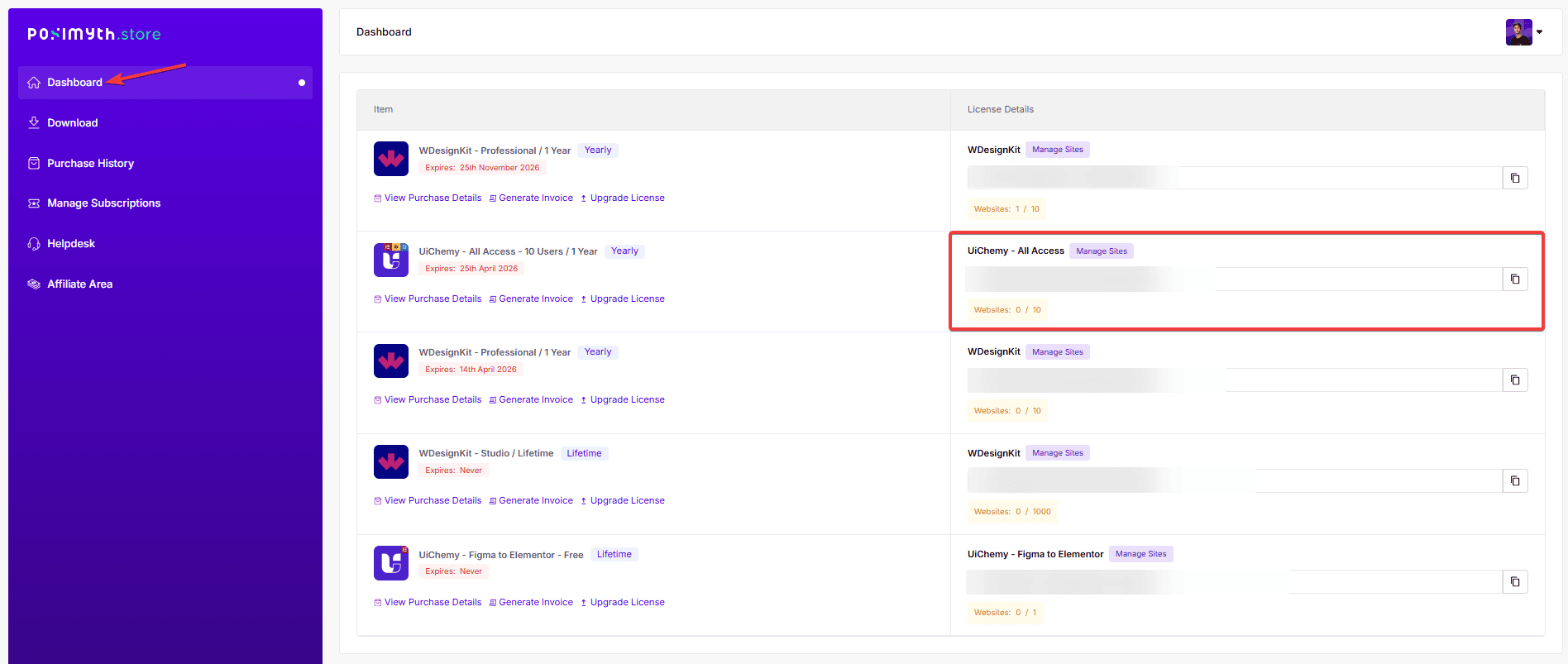 2. In the Dashboard, you’ll find the license key under the UiChemy label.