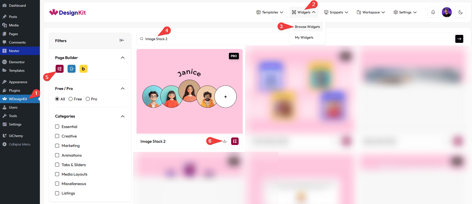 • Search the widget name and select Elementor as the Page Builder.