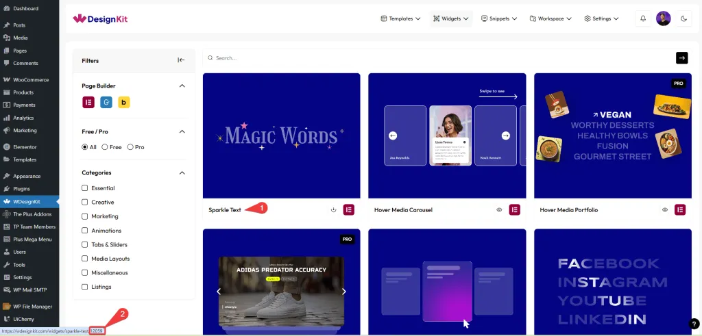 - Widget Unique ID => To find the Unique ID, hover over the widget name on the bottom-left corner, and you will see the widget URL containing its ID.Example: Sparkle Text Widget Unique ID → 12059. Enter this ID into the search bar to instantly filter and display that specific widget on the screen.